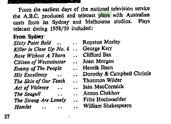 In television live drama, production was equally divided between the Sydney and Melbourne studios and telerecordings interchanged. In all, 22 major productions were telecast, and it will be seen from the titles listed in Appendix 1,7 that we, have now reached the stage when much more ambitious and significant plays can be undertaken.