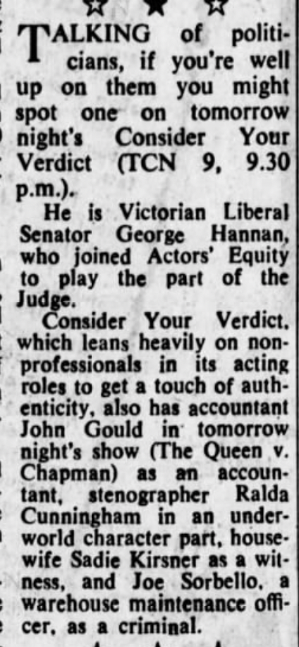 Consider Your Verdict was recorded at Channel 7’s Fitzroy teletheatre, which was actually terrible as a drama studio. It had a lot of echo, which was all right for a court, but worst of all was the roof which wasn’t sound-proofed. So any time it rained you’d hear it, and we had to keep going through that, because you couldn’t be sure it would stop raining in the three hours we had. We used to put up a large note to the judge, and the judge would say “Excuse me Witness, would you please speak up? - The rain on the roof you know!” And we carried on! It explained the rain on the roof, they’d speak up over the noise, and on we’d go! It regularly happened, particularly in winter.